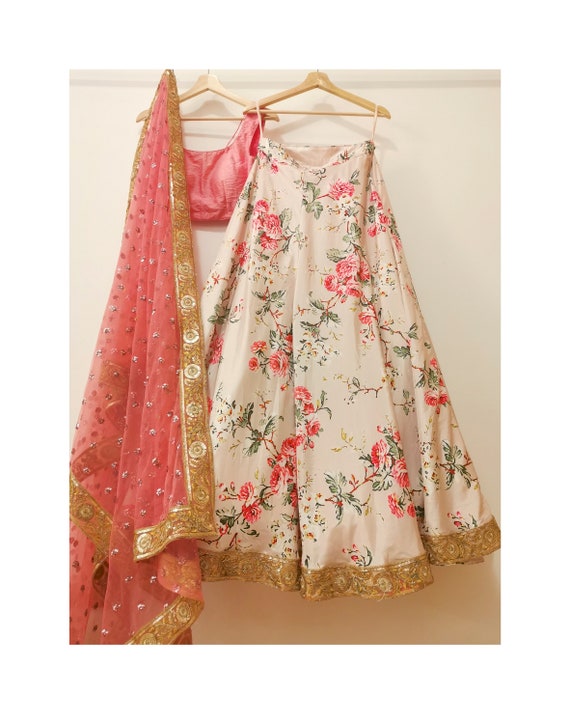 Floral Lehenga With Crop Top Floral Lehenga With Crop Top / Floral crop top in raw silk, with a lehenga in crepe silk an.