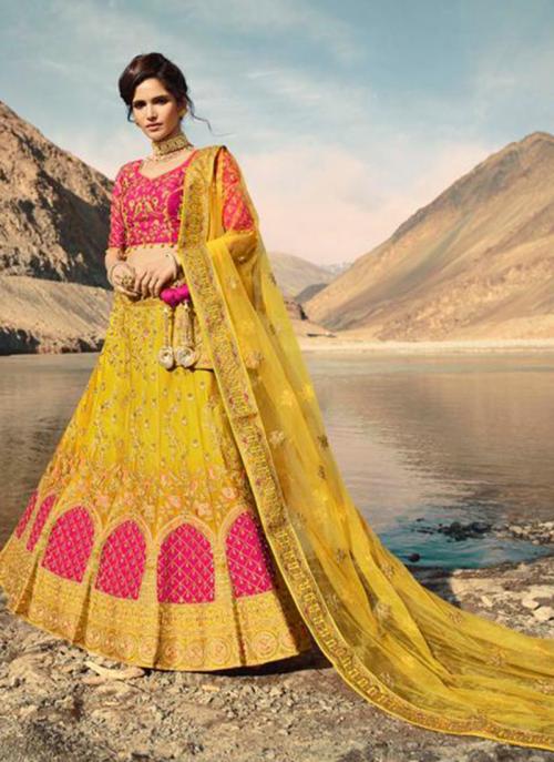 Buy Embroidery Work Pink And Yellow Silk Bridal Wear Lehenga Choli Online From Wholesale Salwar - If you're looking for heavy bridal lehengas, then the it might not be the place to pick up the wedding lehenga.